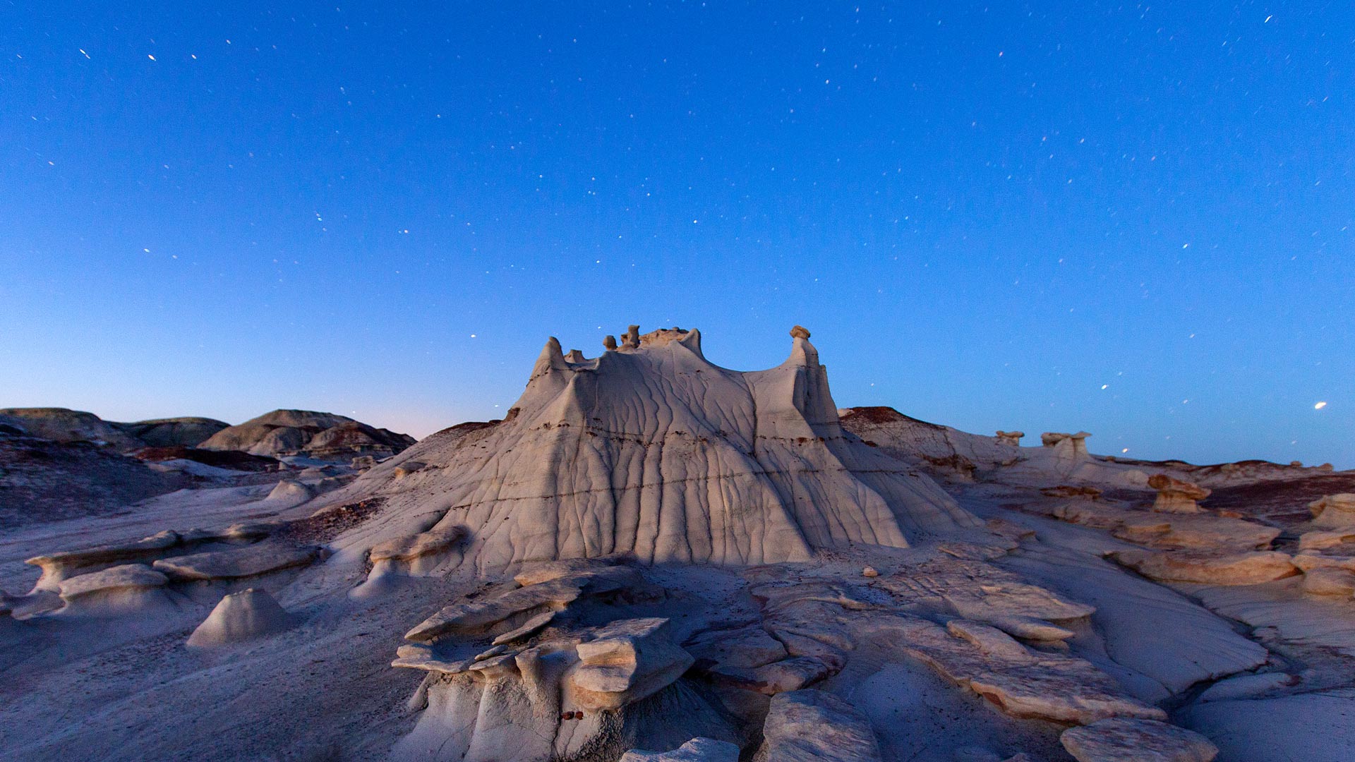 Die Zeit verwandelt unaufhörlich das Universum, die Galaxien, die Welt und uns selbst unaufhörlich. So war zum Beispiel dieses Ödland in New Mexico, USA - die Bisti/De-Na-Zin Wilderness - einst ein üppiger tropischer Regenwald. Vor fast 70 Millionen Jahren gab es hier keine gewundenen Landschaften und hohen Türme, sondern eine Vielzahl von Dinosauriern aus der späten Kreidezeit, darunter gepanzerte Ankylosaurier, Hadrosaurier mit Entenschnäbeln und mächtige Tyrannosaurier. Heute ist das Gebiet voll von Wundern anderer Art, mit Felsformationen, die eher an Skulpturen als an natürliche Phänomene erinnern. Dieses Gebiet ist die Heimat der Navajo- und Pueblo-Völker. Der Name stammt aus der Navajo-Sprache. Bisti bedeutet „ein großes Gebiet von Schieferhügeln“, während De-Na-Zin „Kranich“ bedeutet und sich auf die nahegelegenen Felszeichnungen eines „stehenden Kranichs“ bezieht.