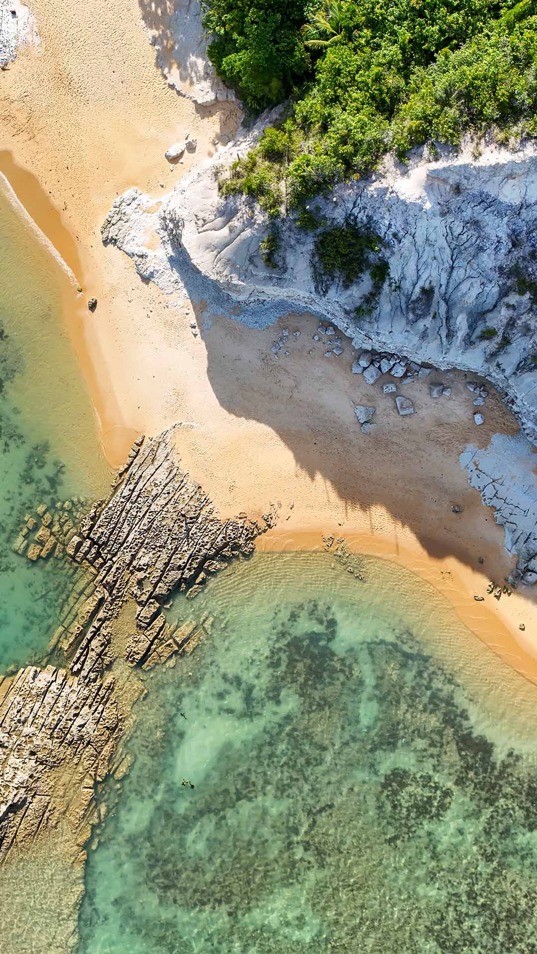 Schon aus der Vogelperspektive wirkt die Praia do Espelho wie ein Gemälde aus Licht und Wasser. Helle Steilklippen, vorgelagerte Riffe und natürliche Gezeitenpools prägen diesen besonderen Ort. Bei Ebbe spiegeln die flachen Wasserflächen Himmel und Wolken so klar, dass der Beiname „Spiegelstrand“ treffend erscheint.