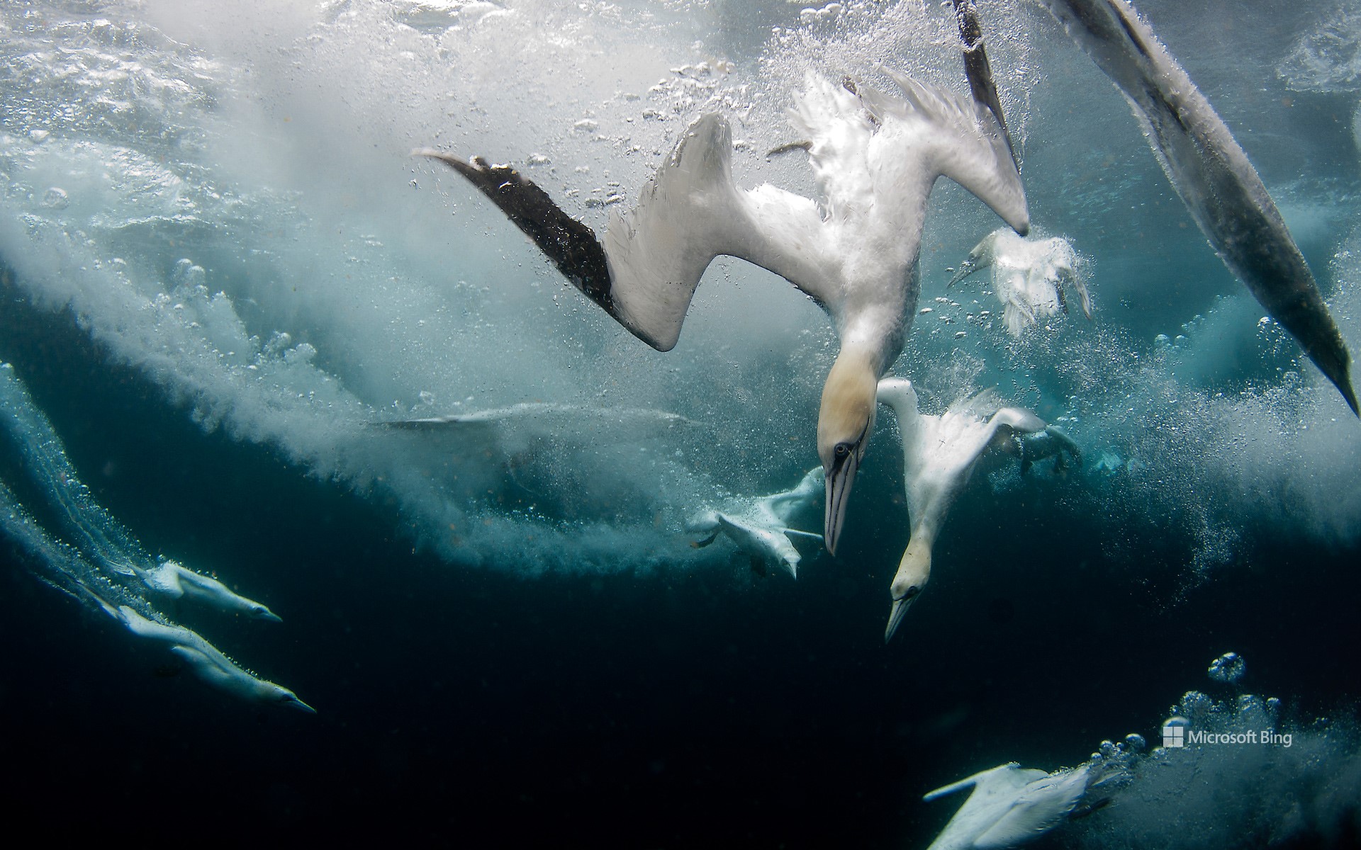 Few birds hunt as dramatically as the northern gannet, which dives straight into the sea, as seen in today's image. Spotting prey from heights of up to 100 feet, the bird folds its wings and hits the water at speeds of over 60 mph. Its streamlined body, reinforced skull, and built-in shock absorbers, such as spongy bone plates and air sacs beneath the skin, make these high-impact dives both powerful and safe. Once underwater, the gannet uses its wings and webbed feet to swim after fish, diving as deep as 70 feet and staying submerged for up to 30 seconds. Its forward-facing eyes provide excellent depth perception, while hidden nostrils prevent water from rushing in during those lightning-fast descents.