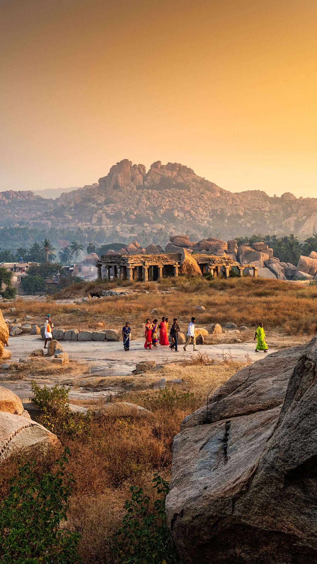 Hampi es un lugar de Karnataka (India) declarado Patrimonio de la Humanidad por la UNESCO. El conjunto de monumentos, templos antiguos, majestuosos palacios e intrincadas ruinas, son restos de la que fue capital del Imperio Vijayanagara, que gobernó esta zona entre los siglos XIV y XVI. Durante el reinado de Krishnadevaraya, de 1509 a 1529, la ciudad experimentó una importante expansión y se llenó de arte y arquitectura, atrayendo a visitantes y comerciantes de todo el mundo. Sin embargo, Hampi perdió su encanto en 1565, cuando fue derrotada en la batalla de Talikota.