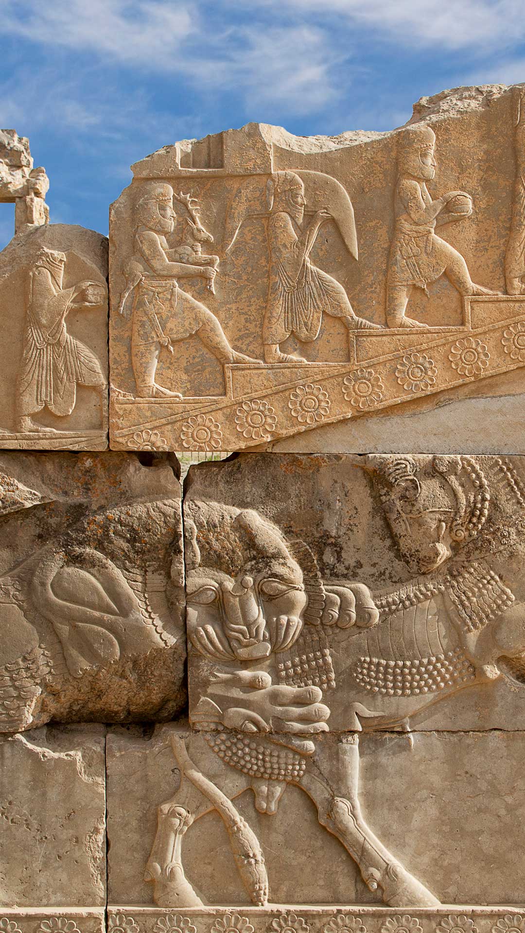 Grabados en la antigua ciudad persa de Persépolis, Irán