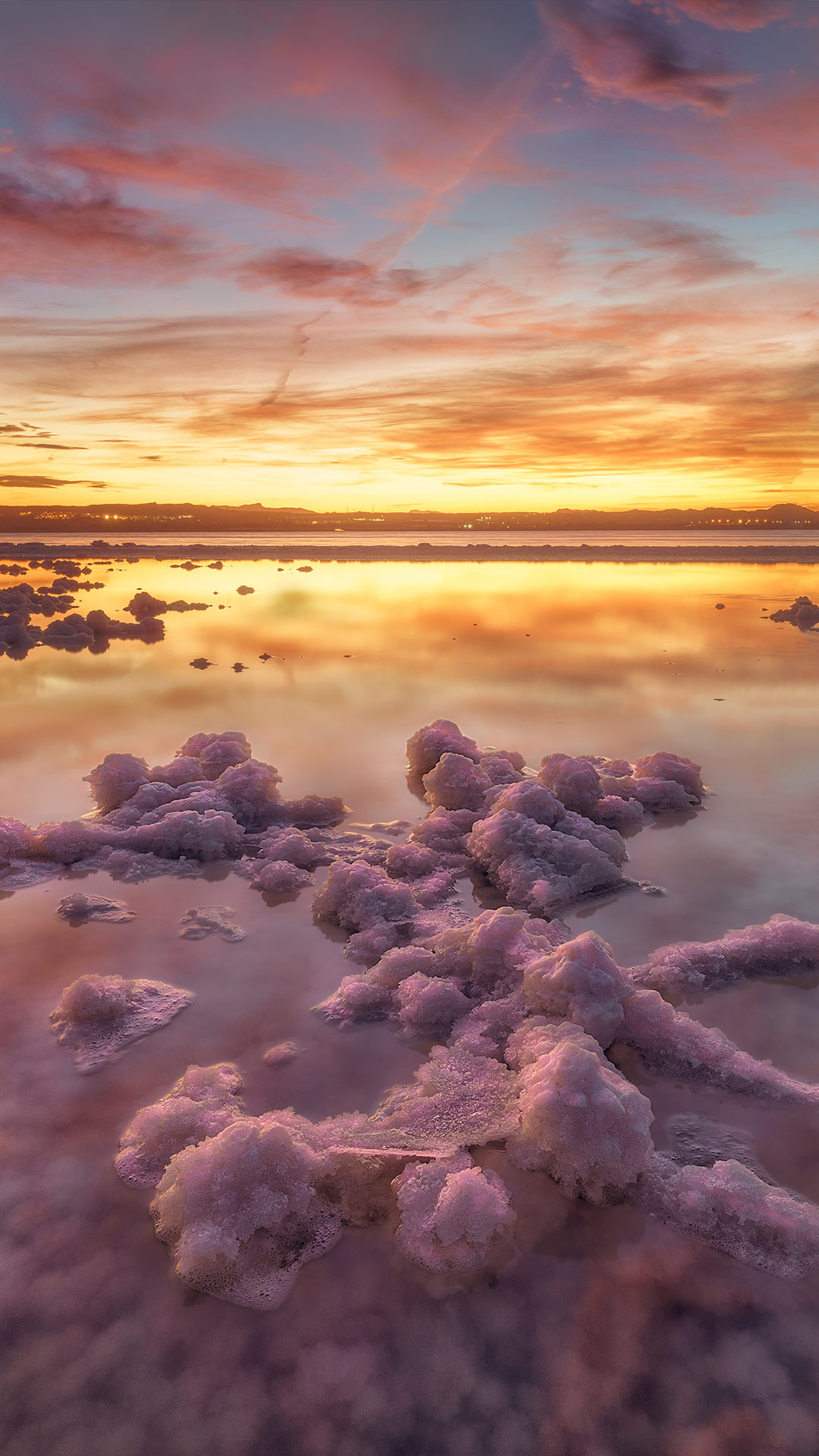 L'acqua altamente salata, che si può vedere naturalmente punteggiata da ammassi di cristalli di sale, è il luogo perfetto per la proliferazione di alghe microscopiche ricche di caroteni. Questo dà luogo alla sfumatura rosata che protegge le alghe dalle radiazioni solari. E il rosa è appena iniziato, perché le alghe vengono mangiate da minuscoli crostacei - che diventano rosa - che a loro volta vengono mangiati dai fenicotteri, che acquisiscono anch'essi la tonalità rosata.