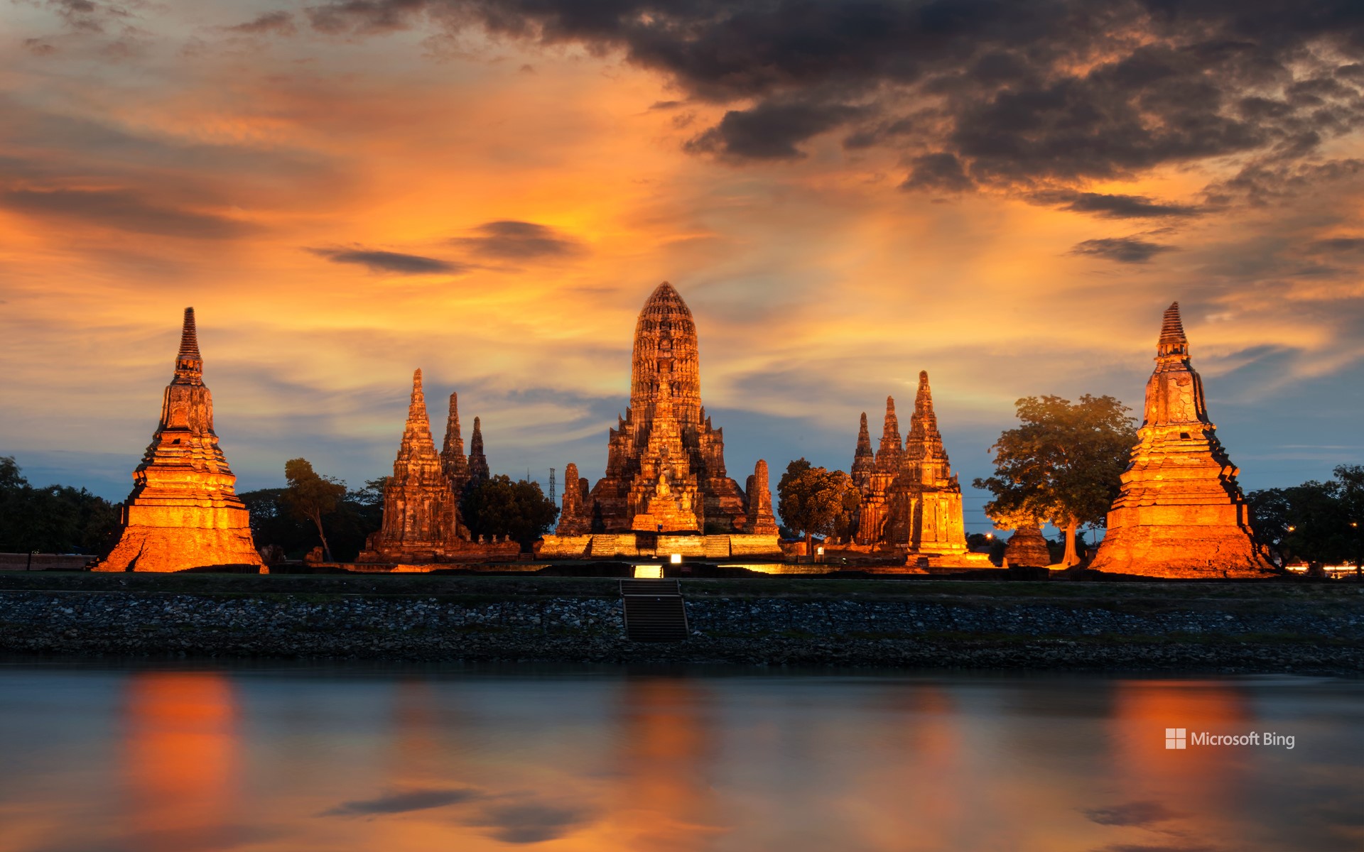 Quando il tramonto getta il suo incantesimo sulla Thailandia, il tempio buddista Wat Chaiwatthanaram si illumina per dare il benvenuto alla notte nel Parco Storico di Ayutthaya. Anche se il tempio non fa parte della vicina Città Storica di Ayutthaya (Patrimonio dell'Umanità dell'UNESCO), la struttura è altrettanto divina e mostra dettagli meticolosi di una ricca storia e architettura.