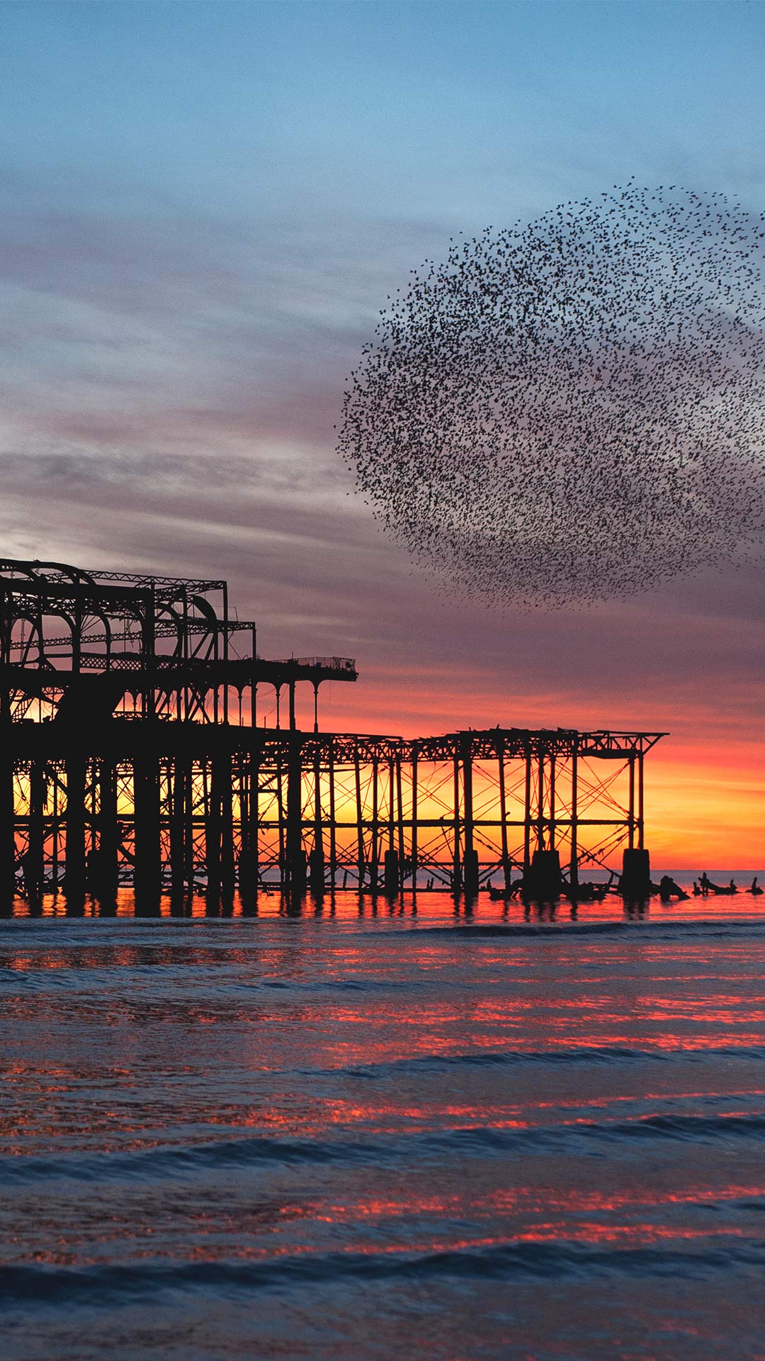 Il West Pier di Brighton, in Inghilterra, può essere una rovina, ma quando gli storni si radunano sopra di esso, lo spettacolo è tutt’altro che decadente. Ogni sera d’autunno e d’inverno, migliaia di questi piccoli uccelli si intrecciano e si avvolgono nell’aria. Gli scienziati suggeriscono che gli uccelli si librino e si avvolgano per confondere i predatori, scaldarsi e condividere informazioni sui luoghi di sosta. Qualunque sia la ragione, il risultato è una danza che lascia i visitatori con lo sguardo rapito, il fiato sospeso e gli occhi che inseguono le curve del cielo, finché lo stormo non si posa per la notte.