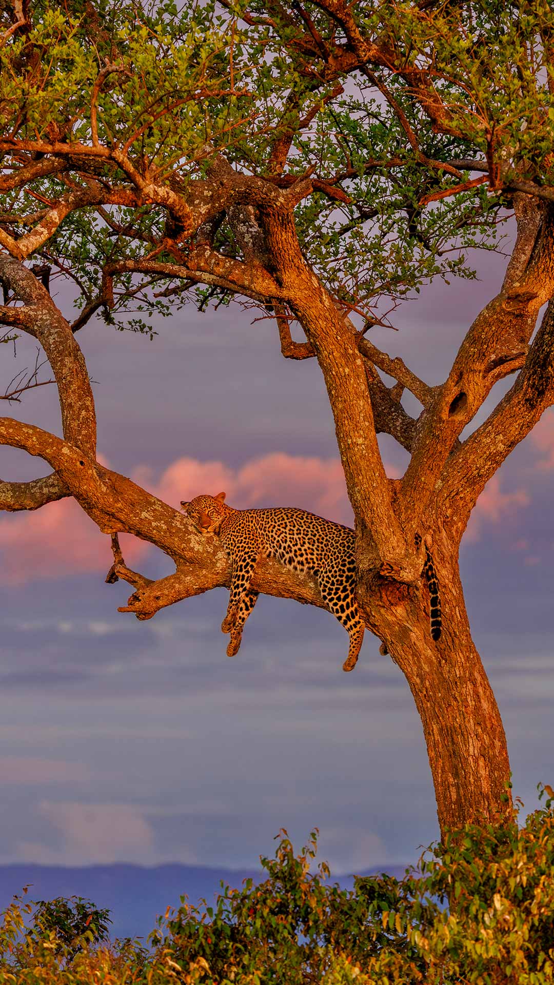 In alto, sopra la savana del Masai Mara in Kenya, un leopardo si rannicchia su un ramo, sonnecchiando mentre le praterie si tingono dei colori del tramonto. È uno dei grandi felini più adattabili al mondo. Vive in gran parte dell’Africa e in alcune regioni dell’Asia, occupando ambienti molto diversi, dalle foreste e dalle montagne alle savane aperte. Il suo mantello maculato è unico per ogni individuo, come un’impronta digitale, e la sua straordinaria abilità nell’arrampicarsi gli permette di mettere al sicuro le prede sugli alberi, lontano dagli spazzini. Attivo soprattutto di notte, il leopardo si affida più alla furtività, ai sensi acuti e alla pazienza che alla velocità. Nonostante la sua resilienza, la specie è in declino a causa della perdita di habitat e dei conflitti con l’uomo. Proteggerlo significa contribuire a preservare l’equilibrio degli ecosistemi in cui vive.