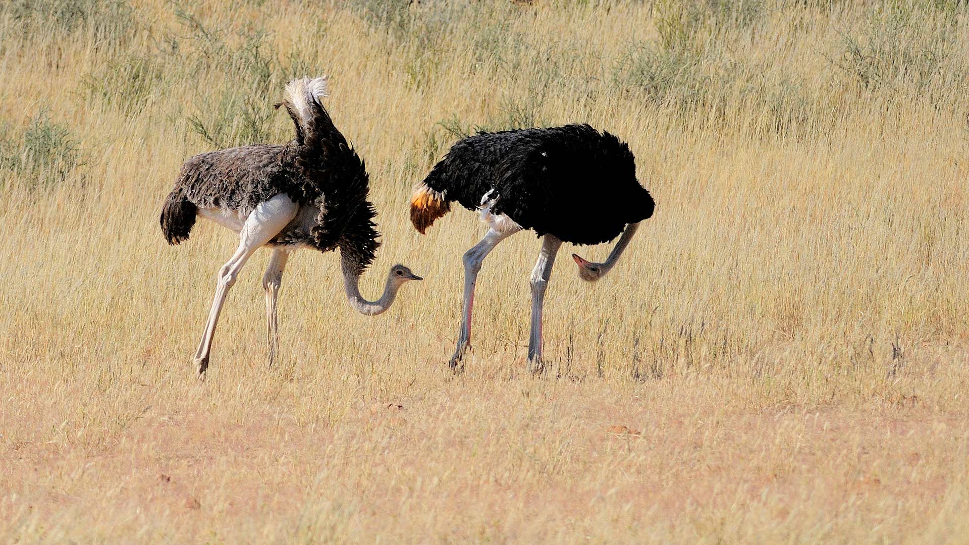 卡格拉格帝边境公园中一对正在求偶的鸵鸟,南非 (© Tina Malfilatre/Minden Pictures)