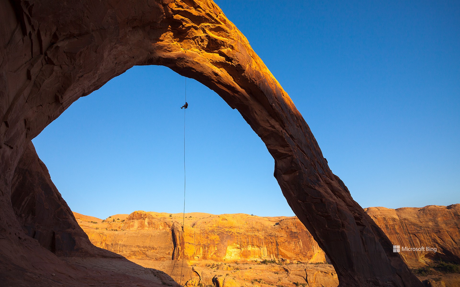 A man rappels off Corona Arch near Moab, Utah, United States (© Grant Ordelheide/TANDEM Stills + Motion)