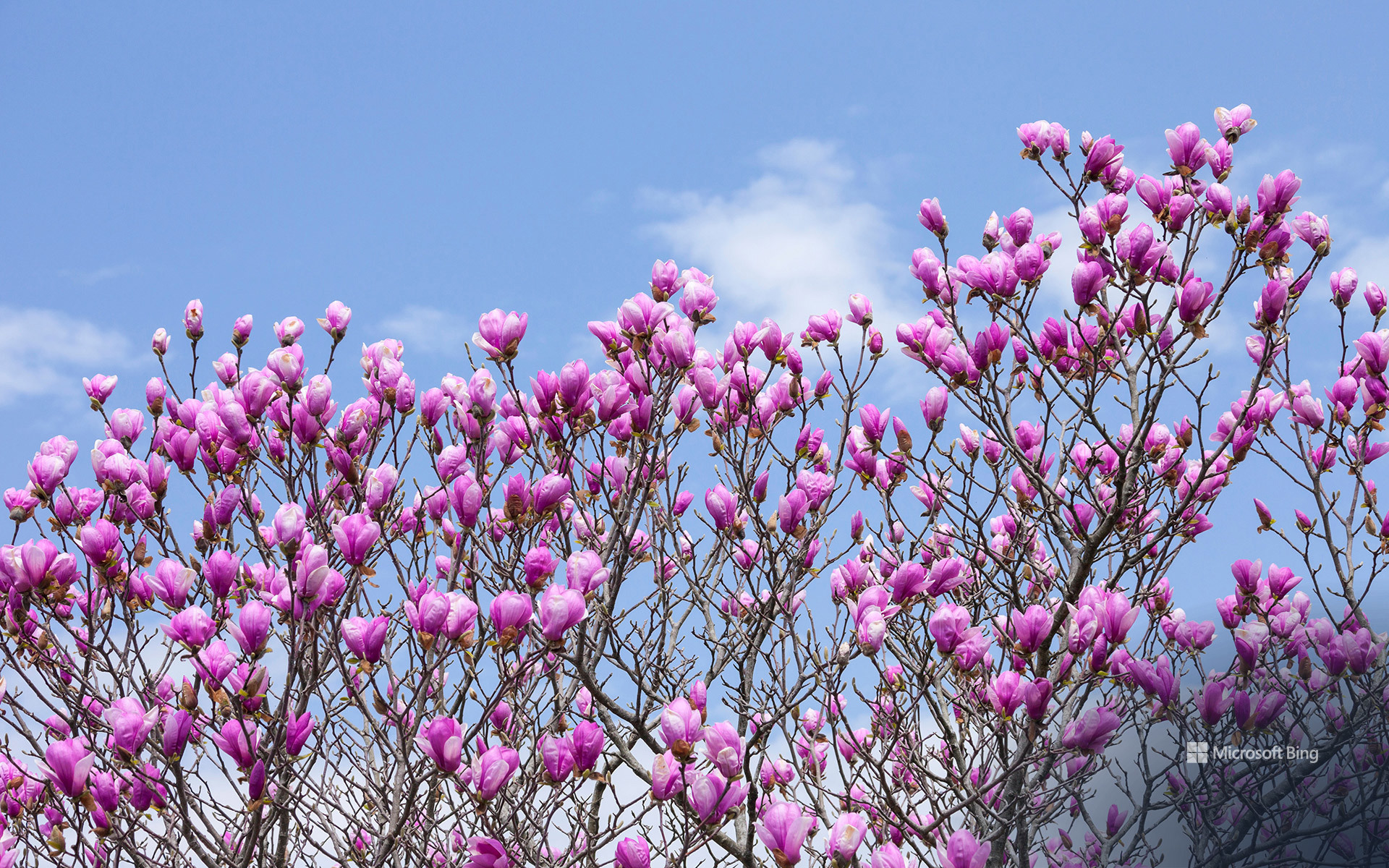 モクレンが咲き誇る季節がやってきました。「モクレン(木蓮)」という名前は、花の形が蓮華に似ており、香りが蘭に似ていることから名付けられたもので、空に向かって花を一斉に咲かせる姿が特徴です。一般的に「モクレン」と呼ぶ場合は、紫色のシモクレンを指すことが多く、白い花のハクモクレン(白木蓮)とは別種のモクレンです。中国南部原産ですが、日本には古くから導入されており、今も昔も、庭園や公園で親しまれることの多い花です。